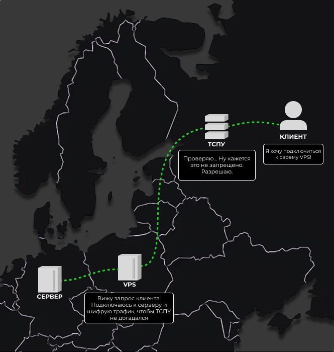 Как видно по схеме - VPN-провайдер находится посередине, между клиентом и сервером. В его обязанности входит программное обслуживание VPS и техническая поддержка. В случае возникновения неисправностей провайдер в кратчайшие сроки ищет новые пути решения, чтобы восстановить работу сервиса.